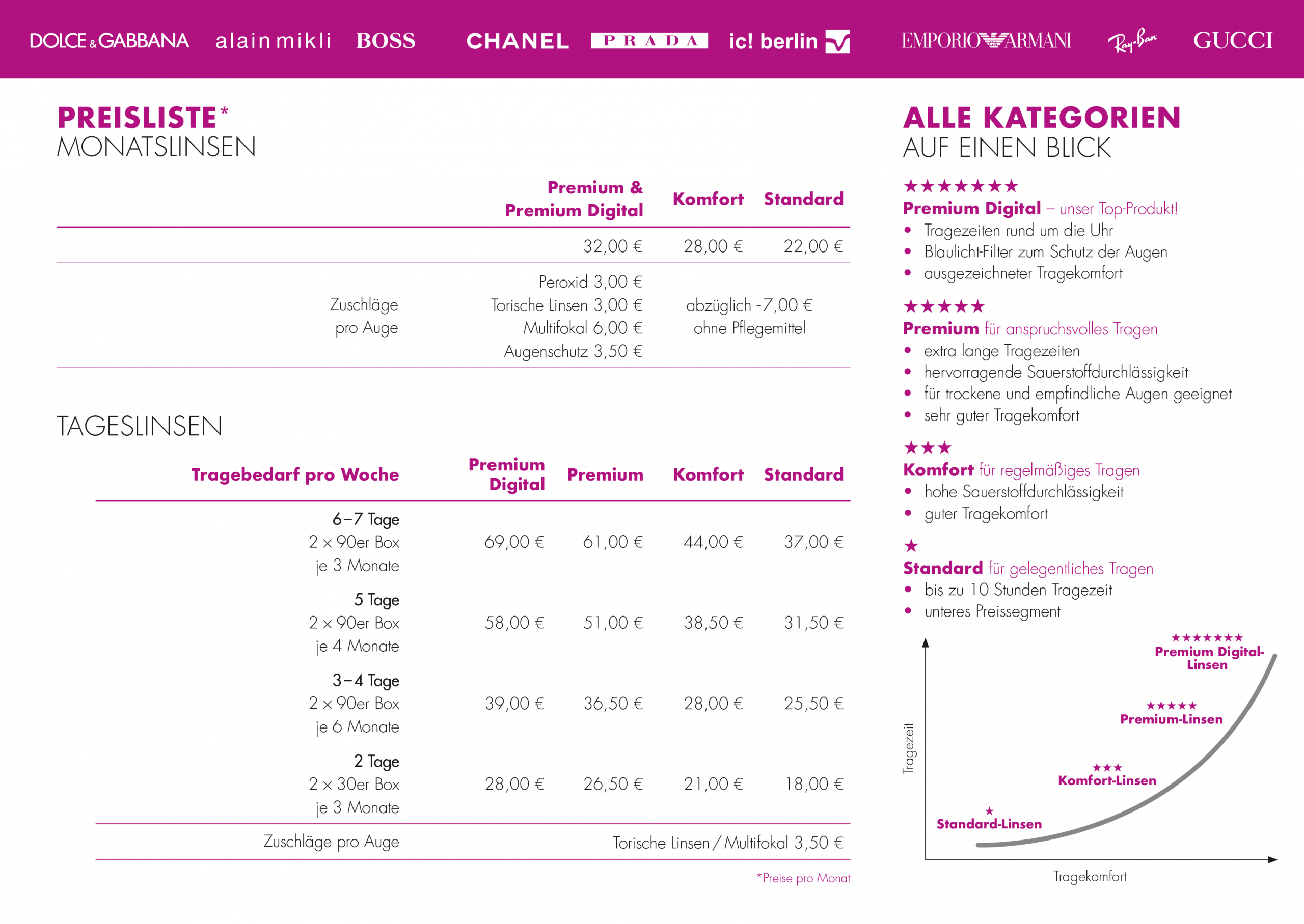 Tageslinsen: Tageslinsen sind weiche Kontaktlinsen, die morgens eingesetzt und abends wieder entsorgt werden. Sie bieten maximale Hygiene und Komfort, da jeden Tag ein frisches Paar verwendet wird, ganz ohne Pflegemittel. Besonders praktisch sind sie für gelegentliches Tragen oder auf Reisen. Tageslinsen gibt es sowohl sphärisch, als auch torisch für Kontaktlinsenträger mit Hornhautverkrümmung und als Gleitsichtausführung.